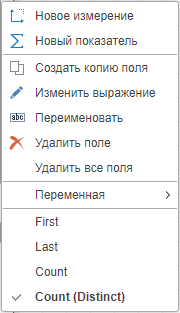 У полей данных элемента присутствует поле Выражение. В нем отображается выражение текущего графы данных, и выпадающее меню со списком команд: