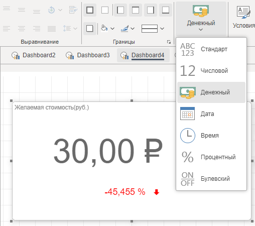 Стоит обратить внимание, что для элемента Таблица и Сводная таблица можно задать форматирование для значений каждого из полей данных.