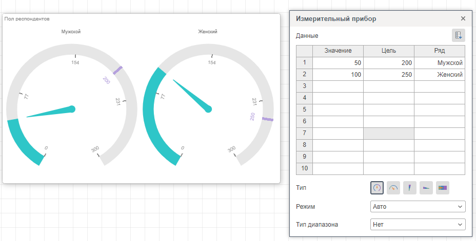 К любому типу измерительного прибора, вне зависимости от указанных значений и рядов, можно определить диапазон. По умолчанию, выбран режим Авто. При этом, начальное и конечное значение шкалы элемента рассчитывается автоматически.