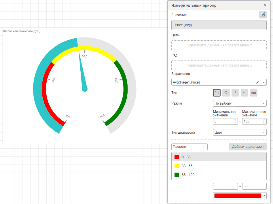 По умолчанию шкала измерительного прибора задана как одноцветная, но можно настроить цвет для определенного диапазона шкалы.