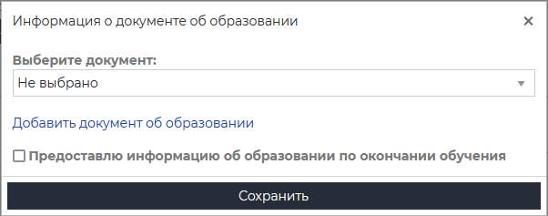 При оформлении заказа на обучение пользователь может указать информацию о документе об образовании. Для этого необходимо нажать на кнопку