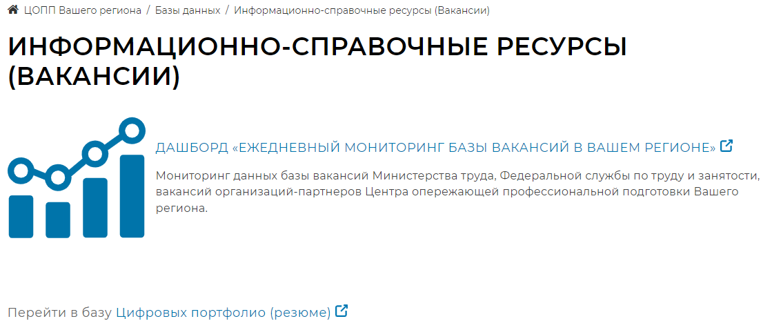 Страница «Каталог вакансий» включает в себя данные мониторинга и анализа актуальной ситуации и динамики изменений на рынке труда региона, сведения о проведенных опросах, направленных на выявление и прогнозирование востребованности рабочих кадров и компетенций. Также на данной странице доступна ссылка на базу Цифровых портфолио (резюме) и База актуальных вакансий региона.