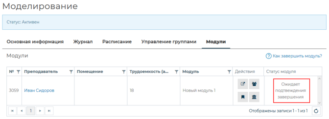 После подтверждения действий статус модуля меняется на «Ожидает подтверждения завершения».