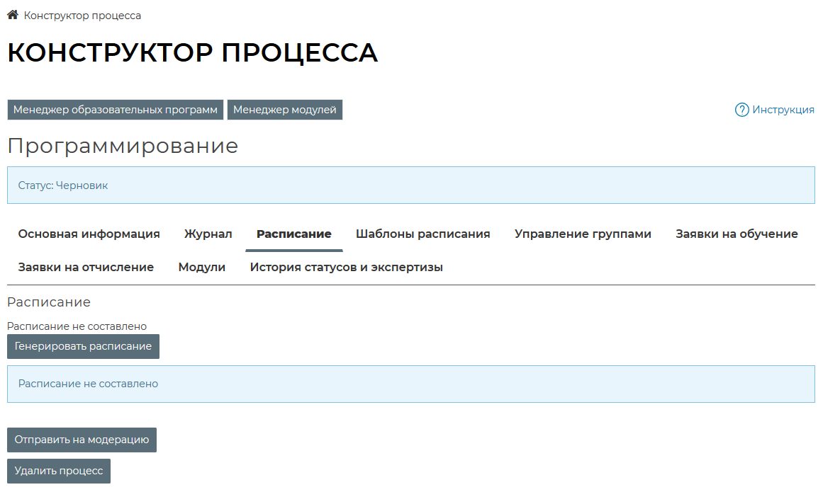 Для того, чтобы составить расписание, необходимо перейти на вкладку «Расписание» Конструктора образовательных процессов и нажать кнопку