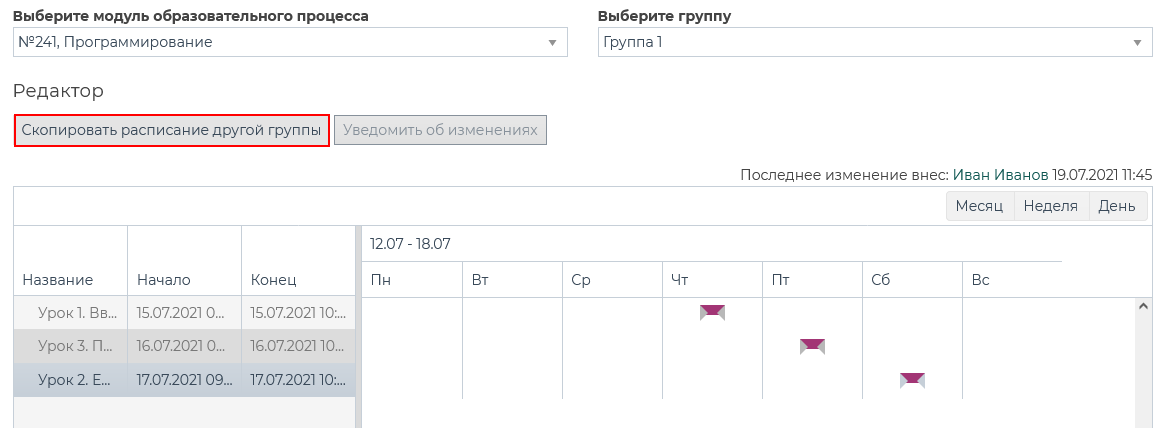 Для того чтобы скопировать расписание другой группы, необходимо нажать на кнопку