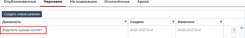 Новое резюме, созданное на основе скопированного появится в списке на странице «Мои резюме» в разделе «Черновик».