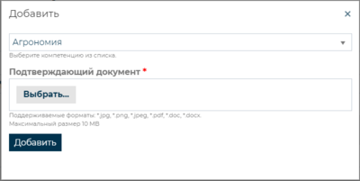 В появившемся окне выбрать компетенцию чемпионатного движения по профессиональному мастерству из списка и прикрепить подтверждающий документ, после чего нажать кнопку