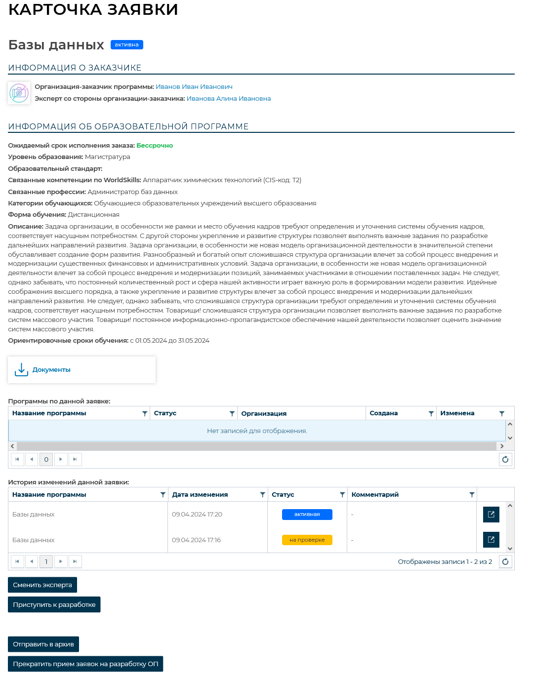 . После чего открывается новая вкладка с Карточкой заявки. На этой странице можно сменить эксперта