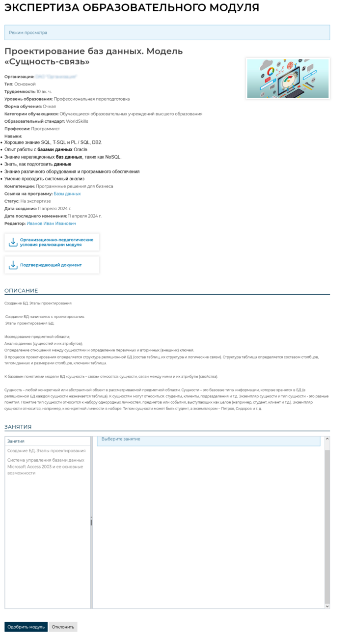 Для того чтобы одобрить или отклонить образовательный модуль, необходимо нажать на кнопку [Карточка]