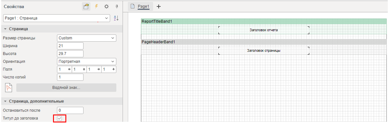 По умолчанию, блок Заголовок страницы (PageHeaderBand) располагается выше блока Заголовок отчета (ReportTitleBand):