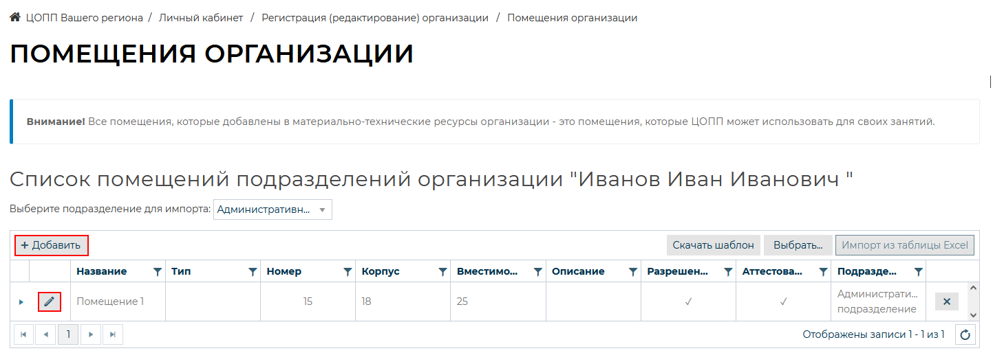 Для добавления/редактирования помещения организации, необходимо нажать кнопку [Добавить]/[Редактировать] и заполнить поля в появившейся форме.