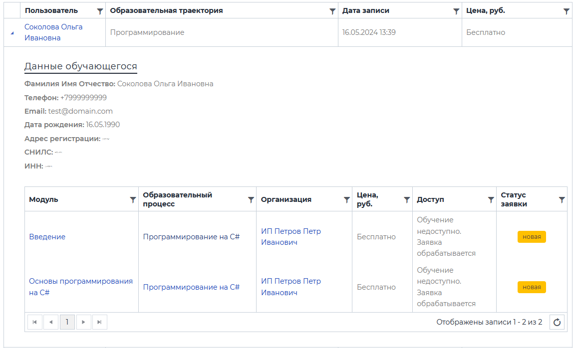 В этом разделе сотрудник ЦОПП может просмотреть все запросы пользователей на образовательные модули и программы, а также данные их профиля.