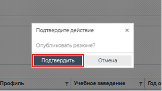 После того, как пользователь заполнил все необходимые поля в процессе создания или редактирования резюме, его необходимо опубликовать в каталоге. Для публикации резюме необходимо нажать кнопку [Опубликовать], расположенную ниже полей конструктора резюме.