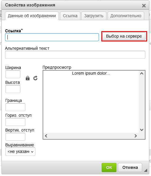 Если изображение ранее не было загружено, то его можно загрузиться самостоятельно во вкладке Ссылка. Для этого нажать кнопку Выбор на сервере, и загрузить необходимое изображение, нажав на символ загрузки