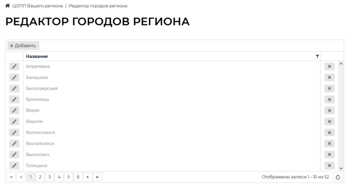 На данной странице администратору и модератору доступно добавление и редактирование городов региона.