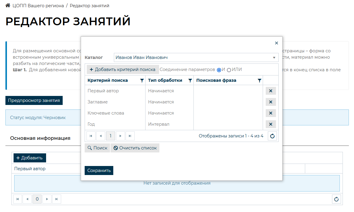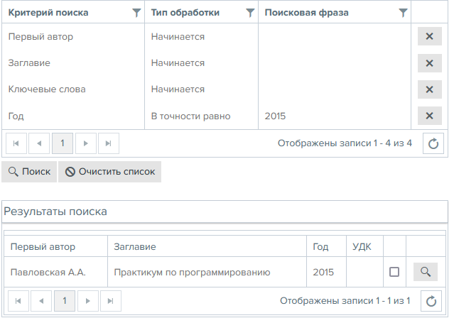 Для их редактирования необходимо кликнуть по выбранной строке, выбрать критерий поиска, тип обработки (начинается, содержит, в точности равно), ввести поисковую фразу и нажать кнопку [Поиск].