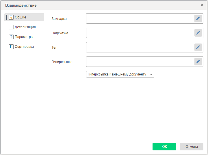 Для того чтобы включить взаимодействие в отчете, следует выделить компонент в отчете и вызвать редактор взаимодействий. Для того чтобы вызвать редактор взаимодействий, следует выделить компонент и на панели свойств нажать кнопку Взаимодействие.