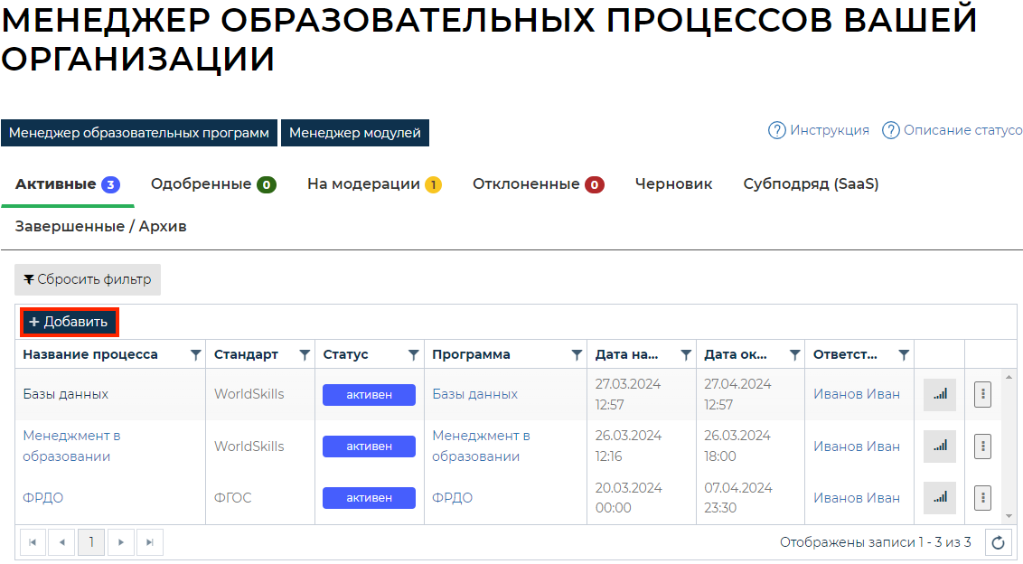 На вкладках «Активные», «Одобренные», «На модерации», «Отклоненные», «Черновик» есть возможность создать новый образовательный процесс. Для этого необходимо нажать кнопку [Добавить]. При этом откроется всплывающее окно с формой добавления процесса.
