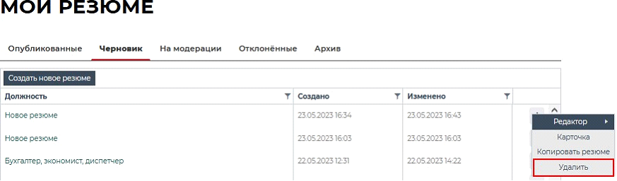 При необходимости, пользователь может удалить созданное ранее резюме, отправив его в «Черновик». Для того чтобы удалить резюме, пользователю нужно перейти на страницу «Мои резюме» и нажать кнопку